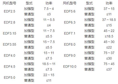3.结构型式 EDF系列风机结构分为普通型和加强型。两者区别在于后者主轴加粗、轴承型号加大,其余相同。加强型与普通型外形尺寸不一致时,外形尺寸上括号内数字为加强型风机尺寸。本公司EDF系列的普通型和加强型分类规定如下: