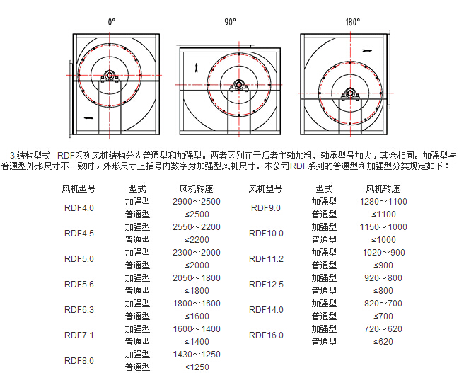 1.风机旋向 RDF 系列可分为左旋(LG)和右旋(RD)两种方式。判别方法:面对皮带轮,叶轮顺时针旋转的称为右旋风机,叶轮逆时针旋转的称为左旋风机。