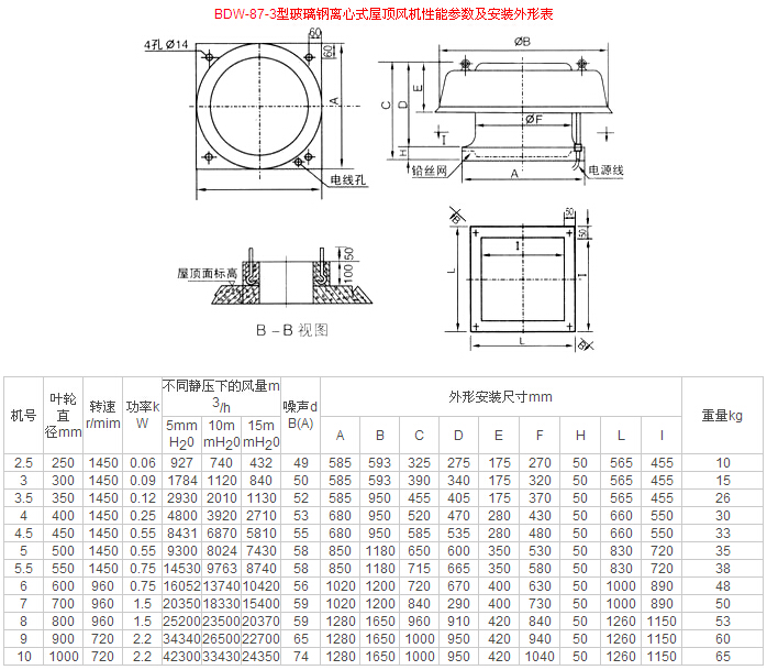BDW-87-3型玻璃钢低噪声屋顶风机是本公司参考国内外同类型风机改用玻璃钢材质研制成的一种低噪声风机。噪声可限制在60(A)分贝以内。本风机具有噪声低、效率高、耐腐蚀、重量轻、运行可靠、安装简单等特点。