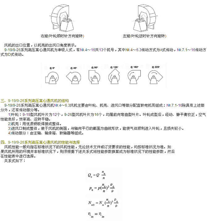 9-19/9-26系列高压离心通风机可制成右旋转和左旋转两种型式。从电动机一侧正视,叶轮顺时针旋专,称为右旋风机,以“右’’表示;叶轮逆时针旋转,称为左旋风机,以“左”表示。